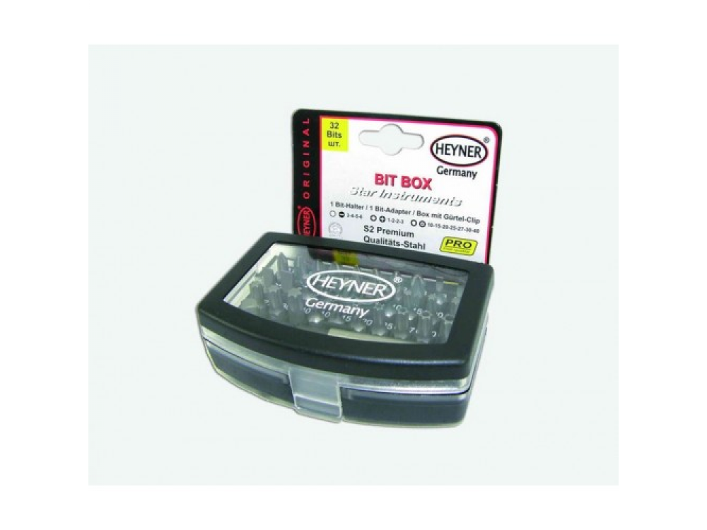 Набор бит 32 предмета. Включает 1 держатель для бит, 1 переходник для бит. 30 бит 25 мм.(+) 1-3, (*) 1-3, (-) 3-6, Н3-6Т10-40, Т10Н-40Н. Суперпрочный пластиковый корпус, с зажимом для пояса вращающемся на 360 градусов.