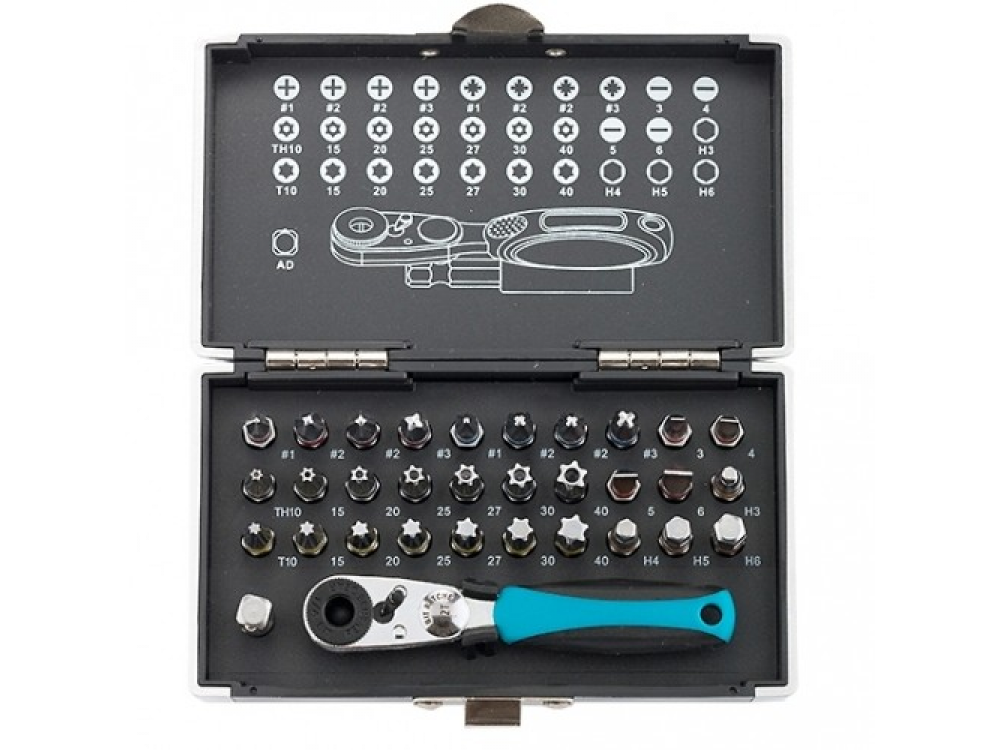 Набор бит и торцевых головок торговой марки GROSS предназначен для монтажа/демонтажа резьбовых соединений при проведении слесарно-монтажных работ. В наборе 30 бит, изготовленных из высококачественной инструментальной стали S2, со шлицами PH1, PH2, PH3, PZ1, PZ2, PZ3, T10, T15, T20, T25, T27, T30, T40, H3, H4, H5, H6, SL3, SL4, SL5, SL6, ТН10, ТН15, ТН20, ТН25, ТН27, ТН30 и ТН40, которые являются наиболее востребованными при проведении различных работ. Для соединения разных типоразмеров в наборе предусмотрен переходник с шестигранника на квадрат длиной 25 мм. Со стороны квадрата в переходнике установлен металлический шарик-фиксатор. Битодержатель из хромированной стали снабжен магнитом, который предотвращает выпадение бит во время работы. Храповой механизм набора (52–зубная трещотка) снабжен эргономичной двухкомпонентной рукояткой, которая удобно располагается в руке и не выскальзывает во время наибольшего крутящего момента.