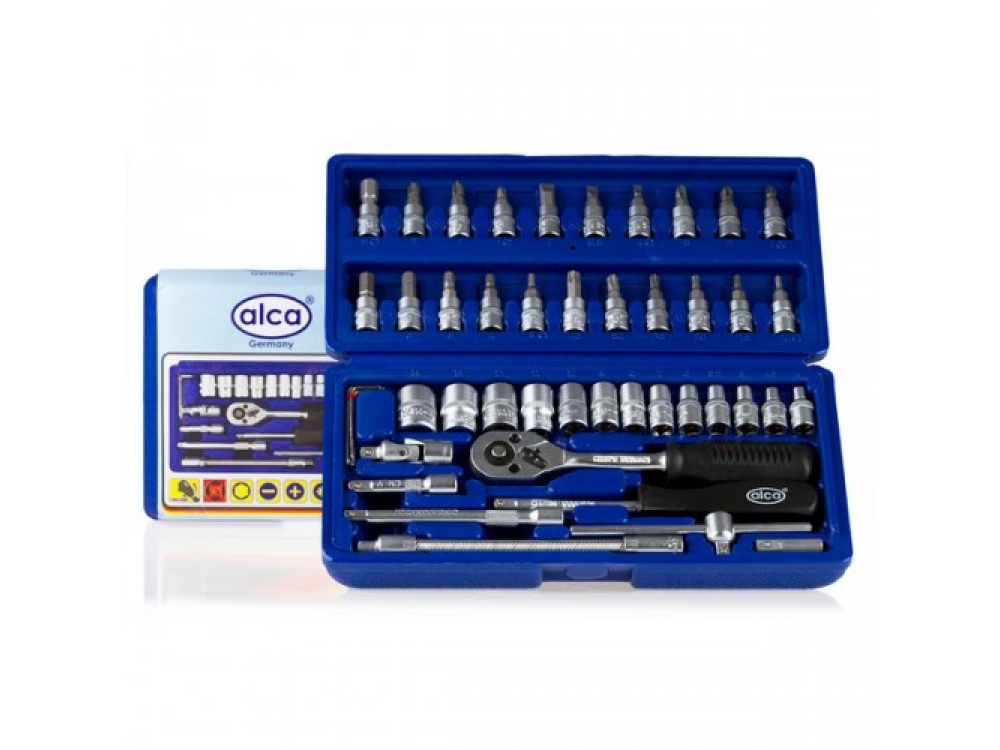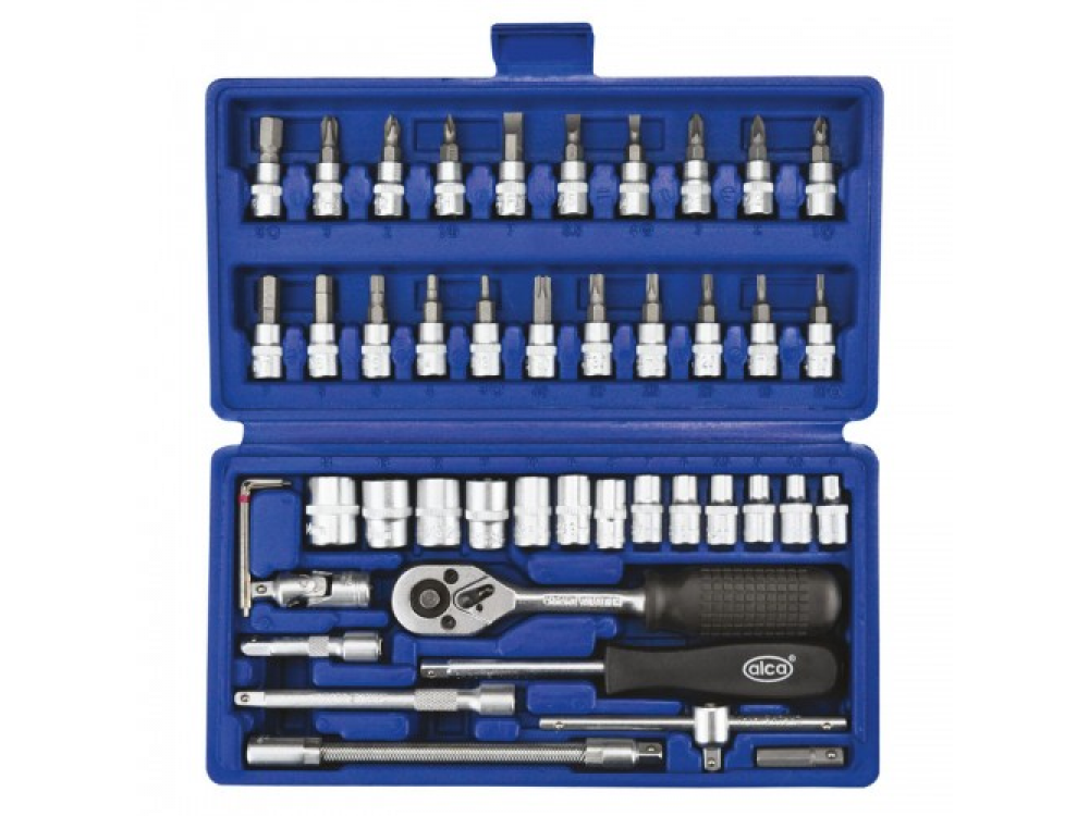 Набор головок, 46 предметов. 13 — шестигранных головок 4-14 мм. 21- бит (-) 4,5.5,7: (+) 1,2,3: (*) 1,2,3: (H) 3-8: (T) 10-40. 3 шестигранных ключа 1.5, 2, 2.5 мм. 1 - карданый шарнир. 2 — удлинителя 5 см и 10 см. 1 — гибкий удлинитель 15 см. 1 — Т образная скользящая рукоятка для шестигранных головок. 1 — трещётка. 1 — рукоятка с внутренним и наружним квадратом. 1 — адаптер для бит. Качественная ванадиевая сталь. Крутящий момент +15%. Крепкий инструментальный ящик.
