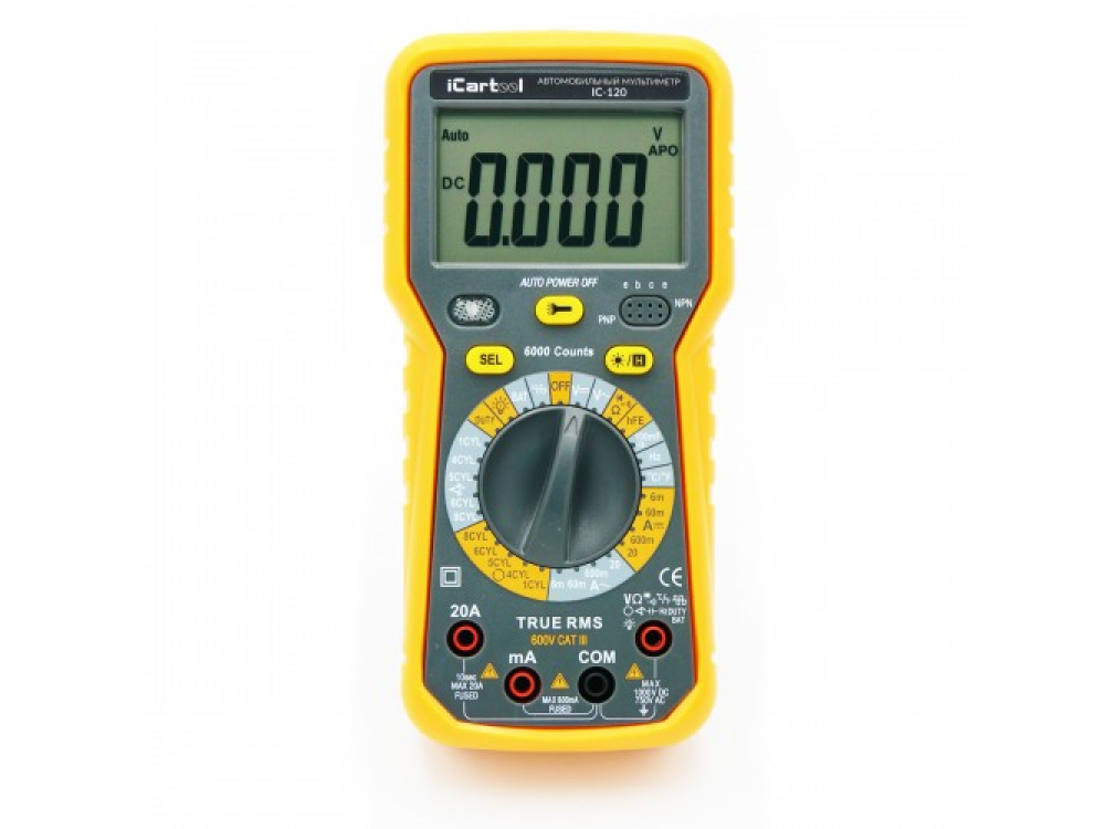 IC-120 Автомобильный мультиметр Цифровой мультиметр IC-120 предназначен для определения ключевых характеристик цепи постоянного и переменного тока и объединяет в себе функционал сразу нескольких отдельных приборов, таких как: вольтметр, амперметр, омметр, термометр.IC-120 имеет широкий спектр применения в электротехнике и электронике, в том числе при диагностике и ремонте электрики автомобилей. Особенности мультиметра: - надежная конструкция, - простота в работе, - точность результатов измерений, - цифровой дисплей, - новейшее программное обеспечение, - функция автоматической калибровки, - превосходная стабильность и воспроизводимость показаний, - наличие защитного кожуха, - широкий ЖК-дисплей, - режим подсветки дисплея и фонарика для работы в условиях слабой освещенности. Разъём «V» подключен к термистору с положительным температурным коэффициентом, что защищает прибор от выхода из строя при неправильном подключении и перегрузках при измерениях. Поворотный переключатель режимов полностью защищен, обеспечивает высокую безопасность и длительный срок службы прибора. - Электропитание: один элемент питания 9В (NEDA160, типа 6F22, КРОНА или эквивалентный). - Индикация низкого заряда элемента питания: с левой стороны ЖК-дисплея в форме символа "батареи". - Размеры: 180?88?53мм. - Вес: примерно 359 г (с элементом питания и кожухом). Условия окружающей среды: - Рабочая температура: 0??40? - Относительная влажность?85% - Температура хранения: -10??50? - Относительная влажность?85% - Точность прибора контролируется при температуре: 23?±5? и - относительной влажности?75%. Устройство автомобильного мультиметра IC-120: - ЖК-дисплей - Кнопка выбора режимов измерения - Разъем для тестирования транзисторов - Кнопка фиксации данных/подсветки - Поворотный переключатель режимов - Тестовые разъемы (выводы) - Индикаторная лампа - Кнопка включения фонарика Комплектация мультиметра IC-120: - Мультиметр IC-120; - Термопара; - Тестовые провода - 2 шт.; - Насадки - крокодилы; - Инструкция; - Упаковка.