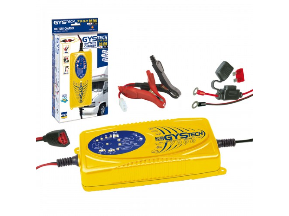 Зарядное устройство GYSTECH 7000 применяется для автоматической зарядки и подпитки свинцовых (жидких или гелевых) аккумуляторов 12В-24В. Идеален для легковых машин, кэмпинг-каров, фургонов, катеров, садовых тракторов, и т.д. Аппарат имеет 4 функции - Заряжает аккумуляторы 12 и 24В. - Техническое обслуживание (подпитка)/зимовка. - Восстановление аккумулятора (для аккумулятора 12В в процессе сульфатации). - Питание 12В/ 5A: зарядное устройство работает как генератор тока 12В. Особенности - Сберегает электронику на борту машины и полностью безопасен: - защищен против коротких замыканий - инверсия полярности - перенапряжение - система против искр - Благодаря защите от влажности и дождя (IP65), может быть использован во влажных помещениях, как например складах, садовых подсобках и т.п. - Автоматическое определение напряжения и включение последнего выбранного режима во время подключения аккумулятора. Технические характеристики Наименование Значение Напряжение питания 230 В Мощность 160 Вт Эффективный ток зарядки 7-3,5 А Промежуточный ток зарядки 7-3,5 А Предохранитель 10 А Габаритные размеры 100х310х290 мм Вес 1,3 кг